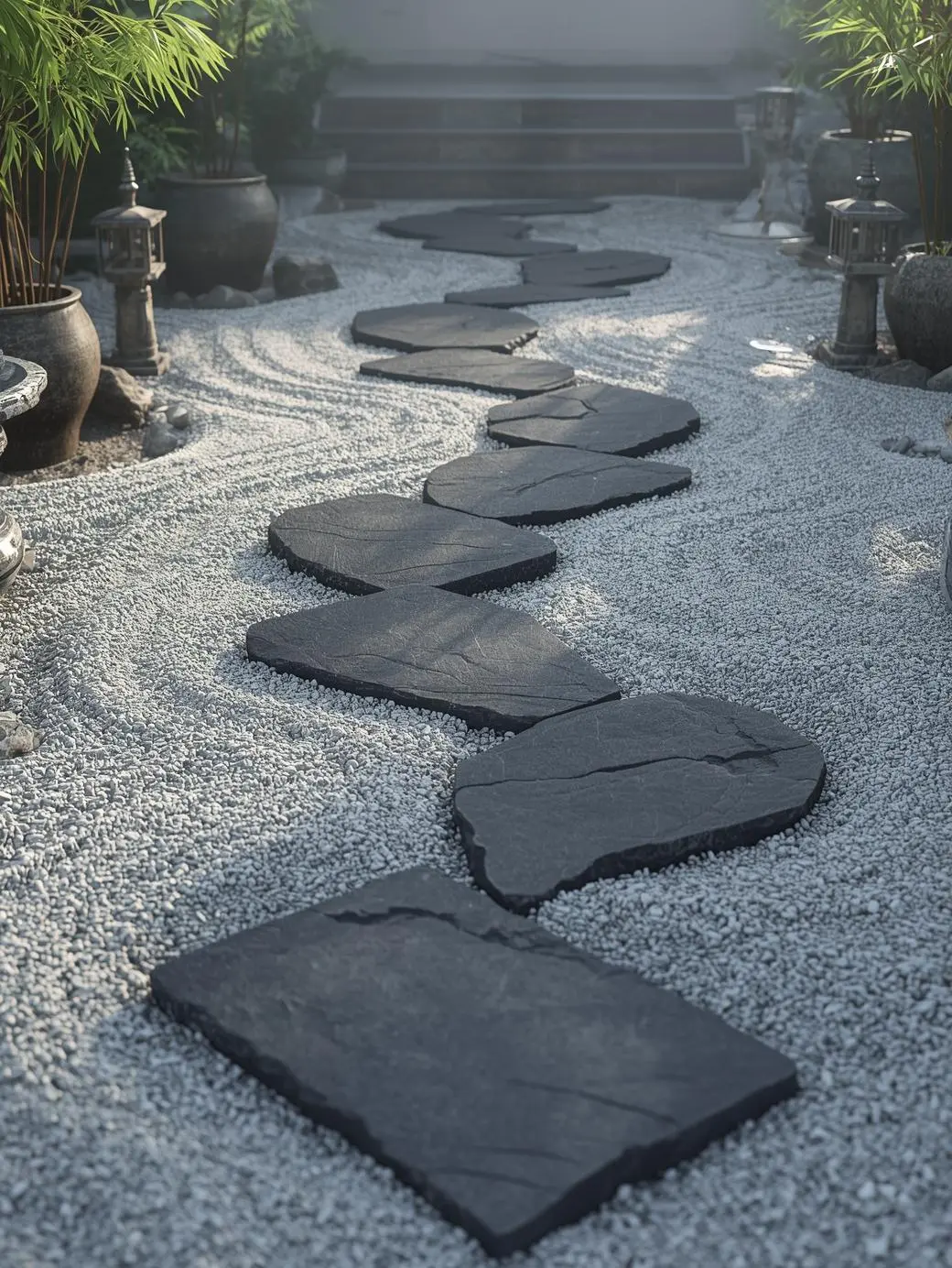 Gravier gris clair ratissé quotidiennement en motifs ondulés + pas japonais en ardoise noire + bambous Phyllostachys en pot + lanternes pierre = voyage au Japon chaque fois que vous rentrez.