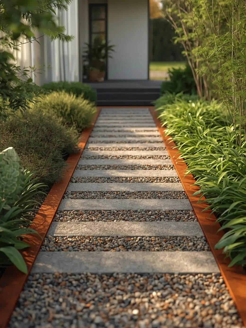 Un jour, lors d’un salon du jardin à Lyon, j’ai vu ces bordures en acier corten de 3mm d’épaisseur et 20cm de hauteur. L’acier corten développe naturellement une patine rouille stable qui protège le métal – aucun entretien requis. Installées tous les 2m avec piquets invisibles, elles délimitent l’allée avec une précision architecturale tout en s’harmonisant avec les végétaux par leur teinte chaude terre de Sienne.