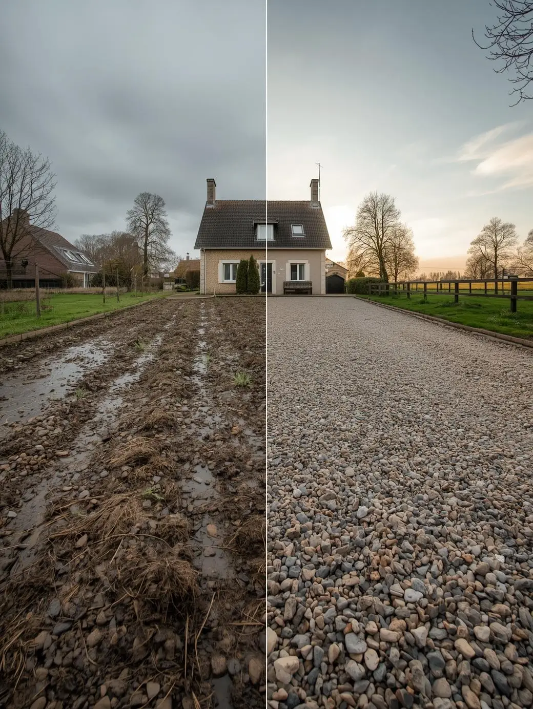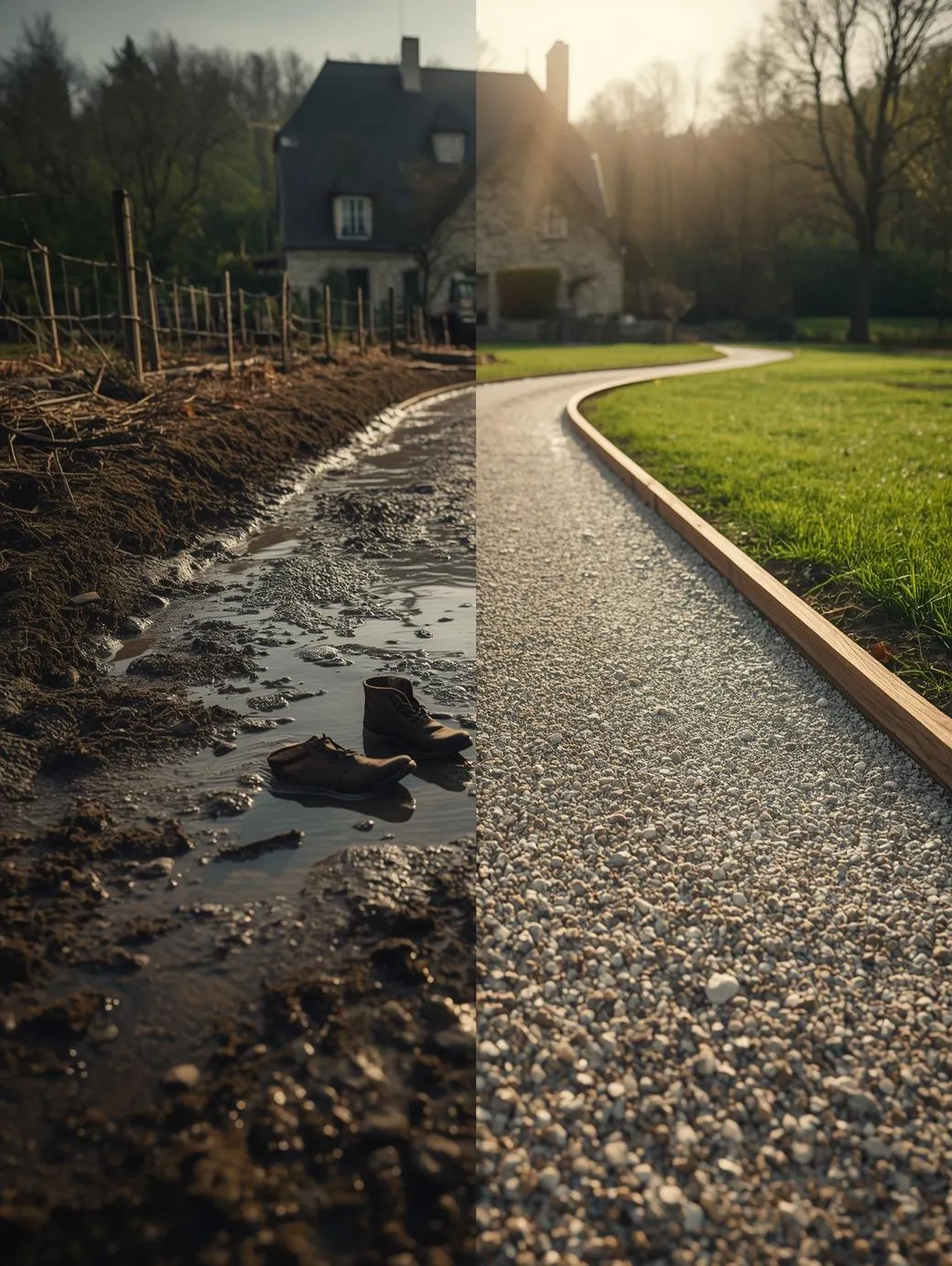 Mon client Paul, agriculteur près de Grenoble, m’a contactée découragé en 2022: « Mon allée se transforme en bourbier chaque automne. Les enfants arrivent à l’école avec les chaussures pleines de boue, ma femme refuse d’inviter la famille. On a honte de notre entrée alors qu’on a une belle ferme. »