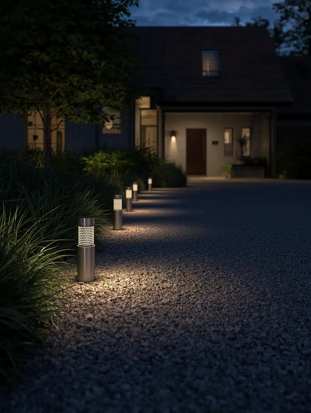 Peu de particuliers pensent à l’éclairage rasant LED solaire placé tous les 3m en bordure d’allée – lumière douce 2700K qui souligne le chemin sans éblouir.