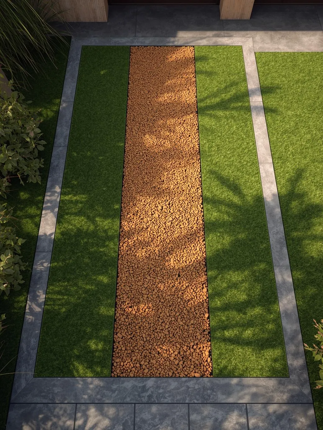 Bande centrale gravier ocre 1,20m + deux bandes latérales gazon 40cm chaque + bordure pierre bleue 15cm – rythme visuel captivant.