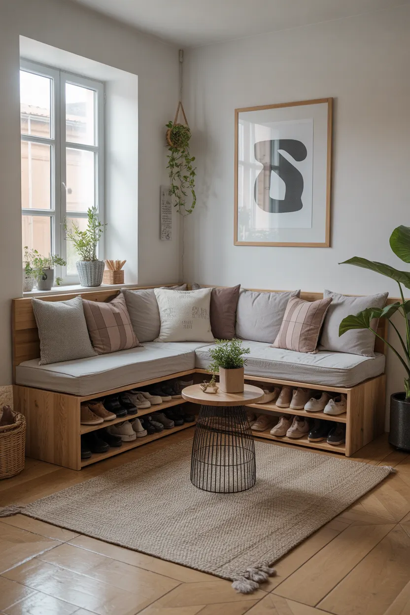 Si vous avez un angle dans votre entrée, pourquoi ne pas en profiter ? Une banquette en L crée un vrai petit coin sympa et optimise l’espace mort.