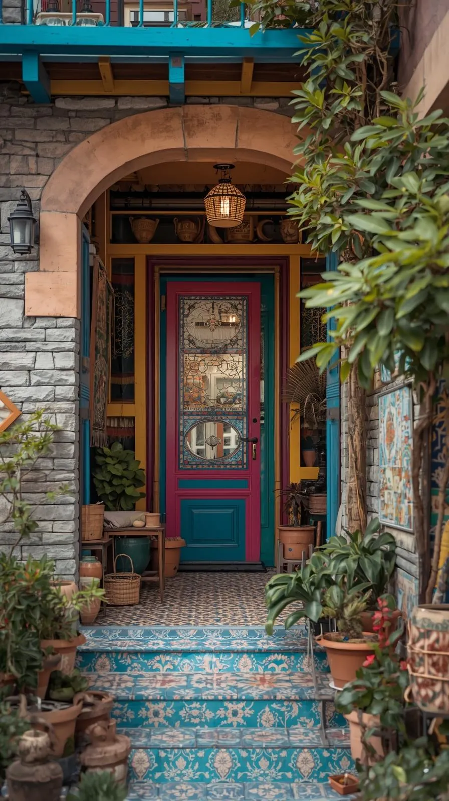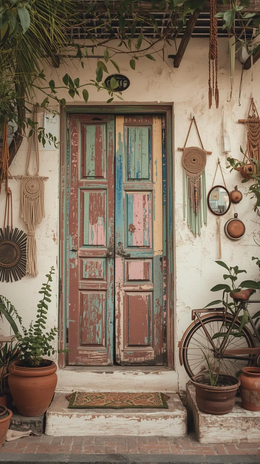 Porte peinte en mille couleurs, objets chinés partout, plantes dans tous les coins… Chaque élément venait d’un voyage, d’une brocante. C’est ça l’esprit bohème pour la déco entrée maison extérieur: unique et personnel!