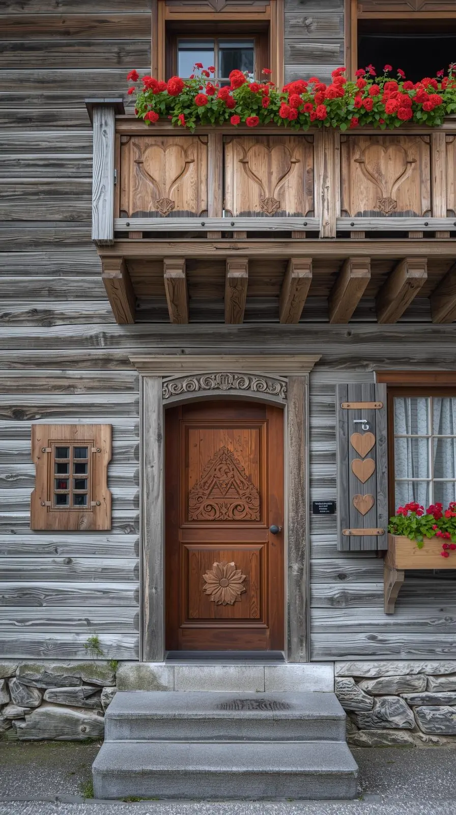 Tu vois ce que je veux dire quand je parle de ces chalets alpins traditionnels? C’est exactement ça: bois patiné, géraniums rouges, sculptures traditionnelles…