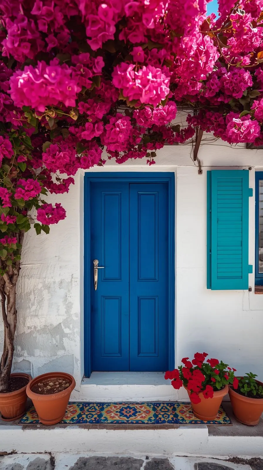 Oh j’oubliais celle-là, mais franchement elle mérite sa place! Une entrée bleue et blanche avec des fleurs partout, c’est les vacances grecques dès que tu rentres chez toi.
