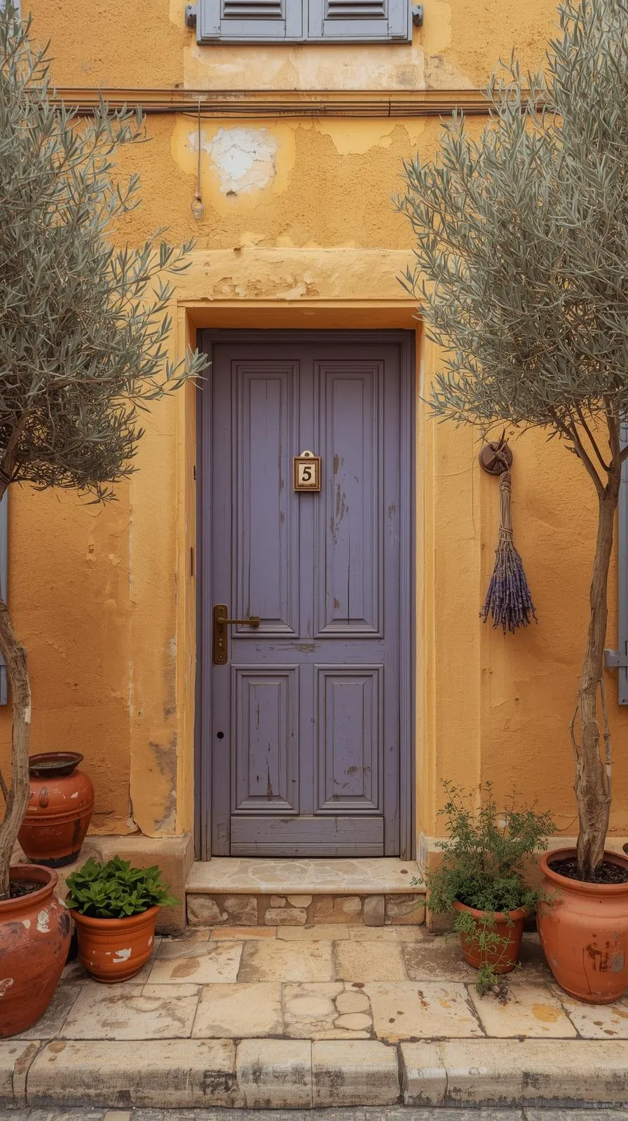 Tu vois ce que je veux dire quand je parle de cette déco entrée maison extérieur qui sent bon le sud? C’est exactement ça: ocre, lavande, terre cuite…