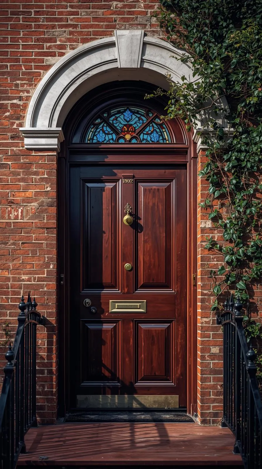 Bon, là c’est un peu mon côté romantique qui parle pour cette déco entrée maison extérieur. Mais franchement, une entrée victorienne avec ses vitraux colorés et son acajou brillant, ça a un charme fou.