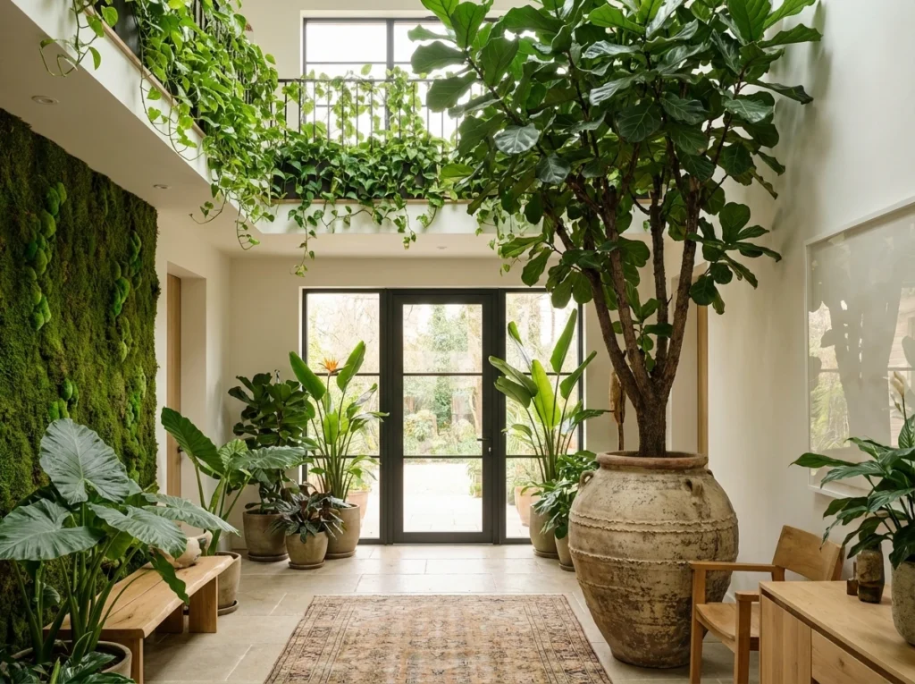 Mes clientes veulent de la nature dès l’entrée. Murs végétalisés, jardins d’hiver, compositions florales permanentes : le végétal devient architectural.