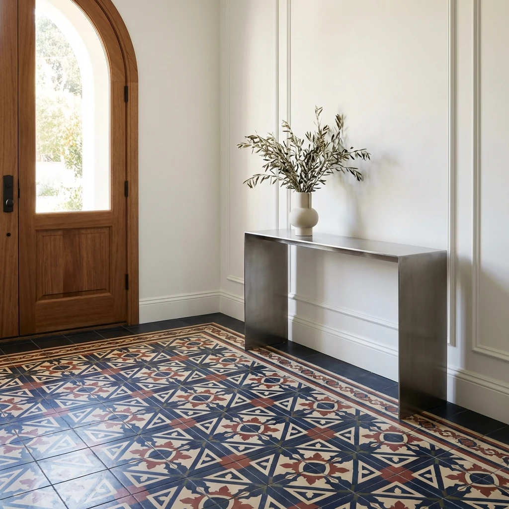 “Ce carrelage, c’est du grand art !”, s’extasie encore ma cliente Béatrice en contemplant son carrelage entrée maison moderne. Nous avons choisi des carreaux de ciment reproducés par une manufacture centenaire : motifs géométriques bleu nuit et blanc cassé, posés en diagonale pour agrandir visuellement l’espace.
