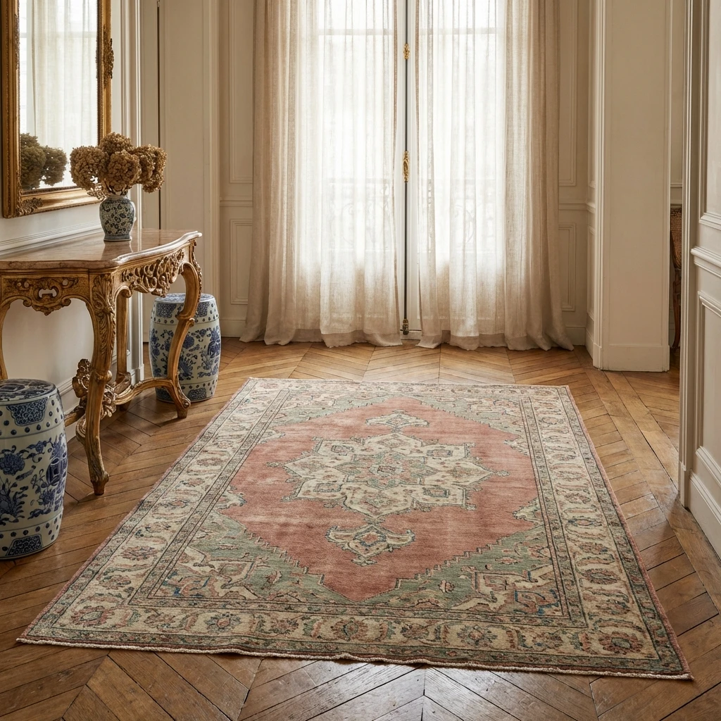 Chez Stéphanie, nous avons opté pour un tapis persan vintage – 400€ en brocante – qui révèle toute la noblesse de son parquet Versailles restauré. Cette alliance entre tradition et modernité illustre parfaitement l’art de créer une entrée maison dans le salon ouvert.
