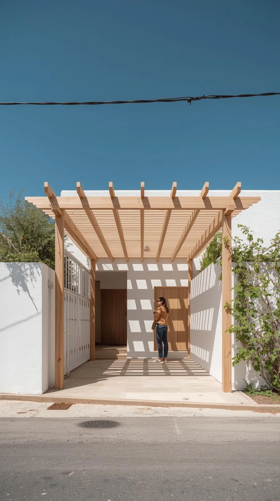 Protection pluie, ombre bienvenue l’été, support pour plantes grimpantes (glycine, jasmin, vigne vierge). Ça redéfinit architecturalement votre seuil.