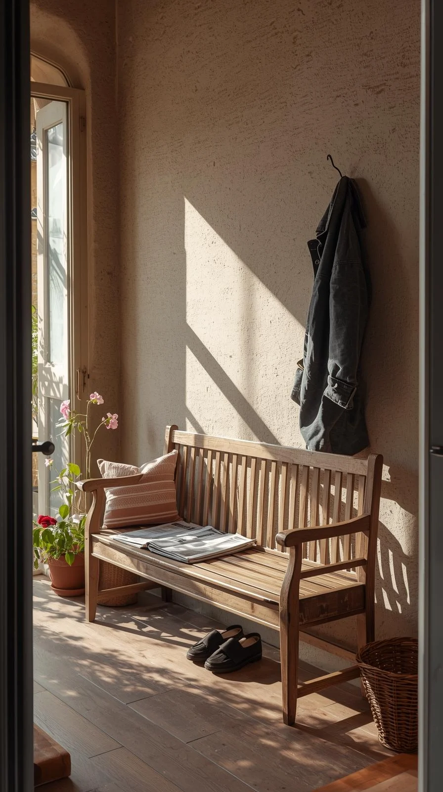 Voici ce qui se passe concrètement: vous installez un petit banc (60-80cm de long suffit) contre le mur près de votre porte. Ça devient instantanément l’endroit où s’asseoir pour enlever ses chaussures, où poser les courses 30 secondes pendant que vous cherchez vos clés, où votre facteur dépose les colis quand vous n’êtes pas là.