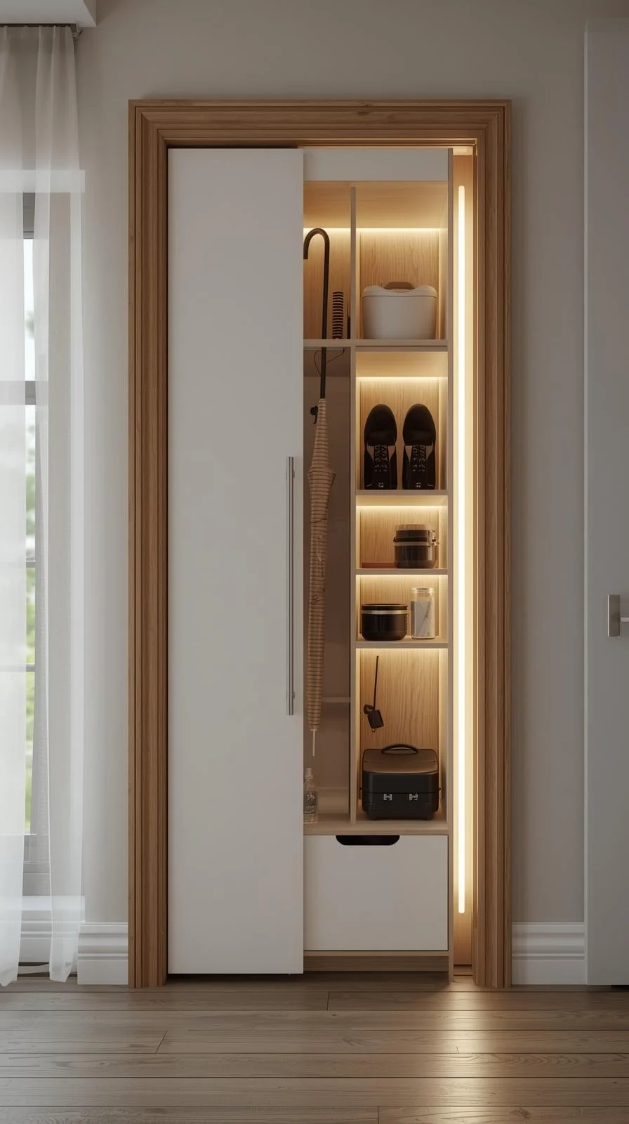 Vous le tirez quand vous avez besoin d’un parapluie, d’un chausse-pied, ou de votre brosse à chaussures. Le reste du temps? Invisible et ne vole aucun espace de circulation.
