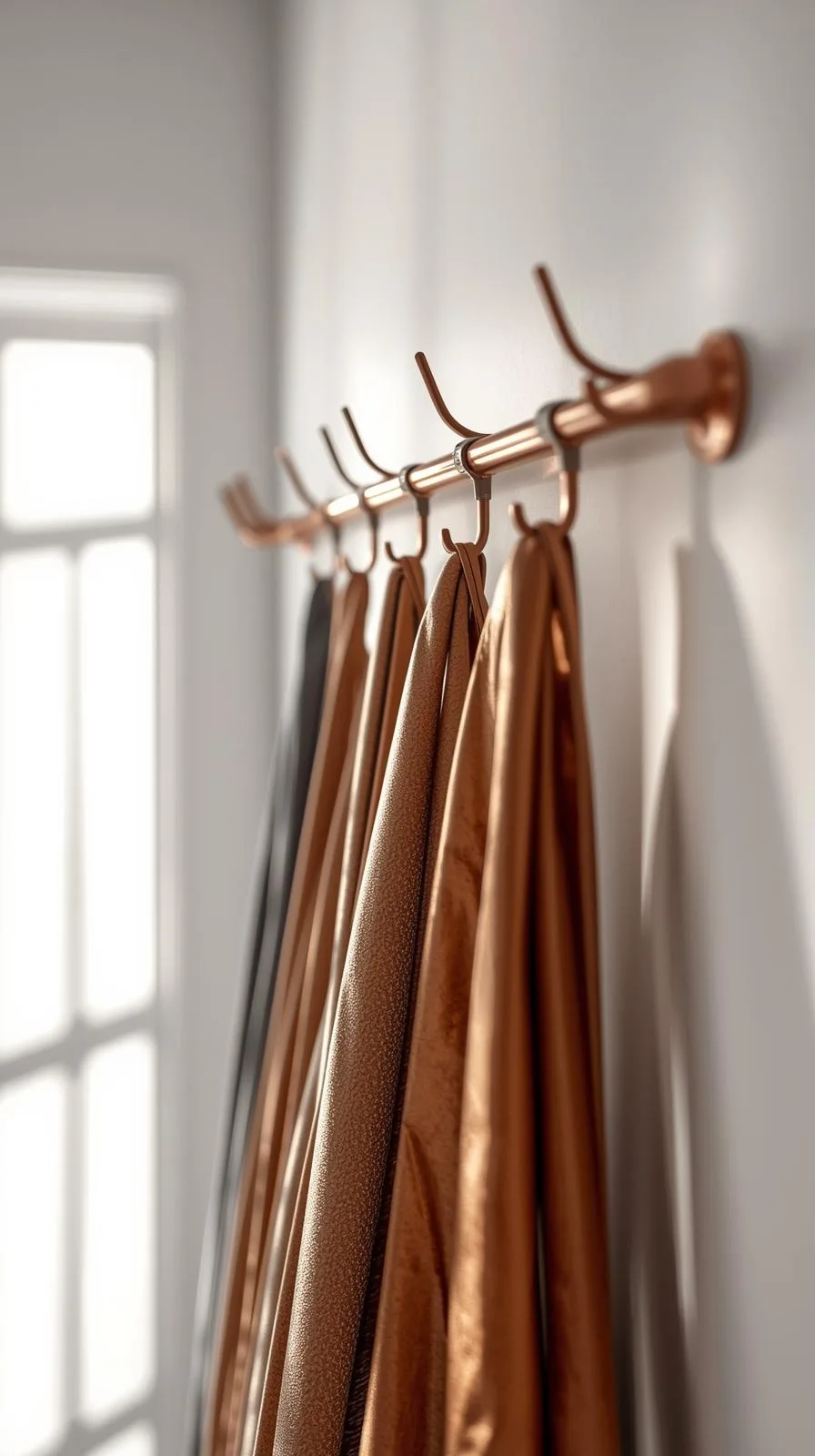Avant j’utilisais des crochets blancs basiques alignés. Maintenant: barre en tube de cuivre (2cm diamètre) avec sangles cuir suspendues.