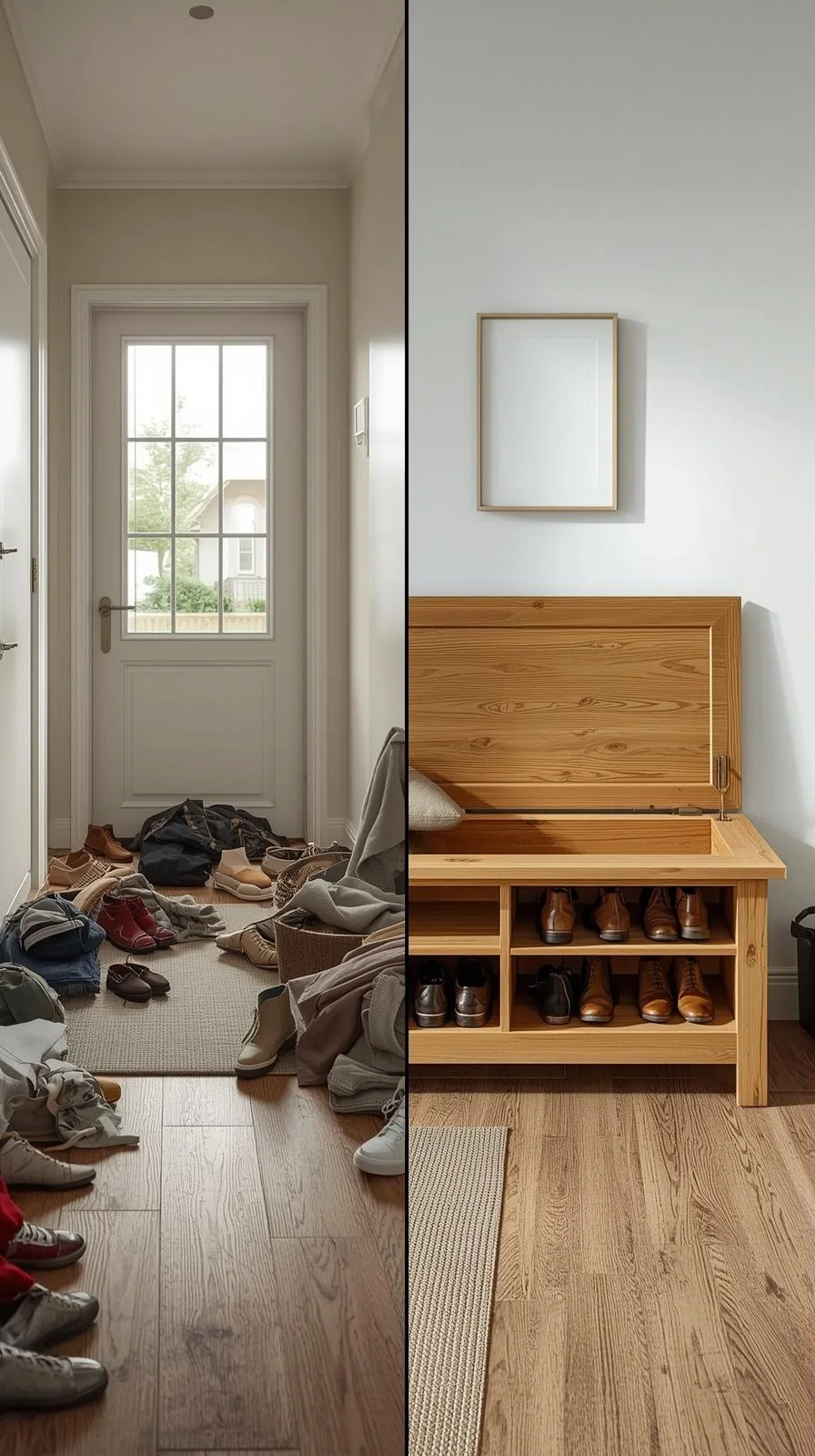Voici ce qui se passe concrètement: vous rentrez, vous vous asseyez dessus pour retirer vos chaussures confortablement. Vous ouvrez le couvercle, vous rangez les chaussures à l’intérieur. Terminé le tas informe qui vous accueillait chaque soir. En prime, le dessus devient une surface pour poser votre sac en arrivant.
