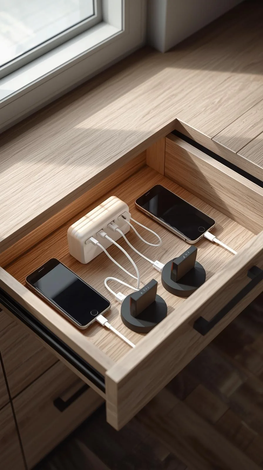 Vos téléphones se rechargent dès l’entrée dans la maison, plus de « zut, batterie morte » le lendemain matin. Le tiroir fermé cache le bazar de câbles.