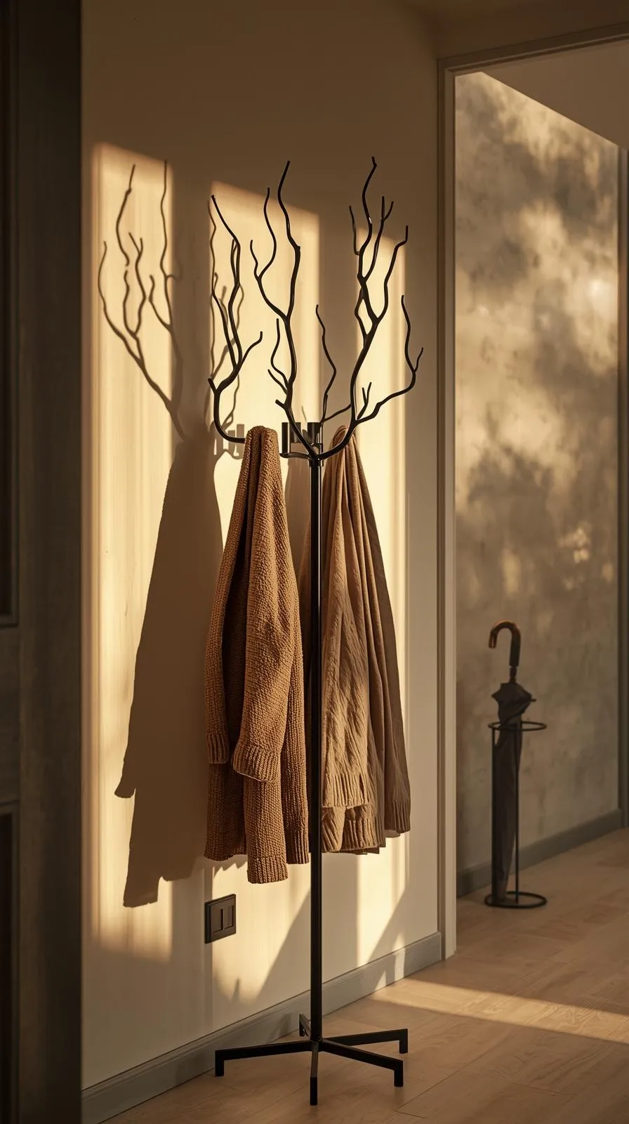 Au lieu de crochets tristounets alignés, imaginez des branches métalliques noires qui montent comme un arbre stylisé sur votre mur. Vos manteaux deviennent une installation artistique au lieu d’un tas informe.