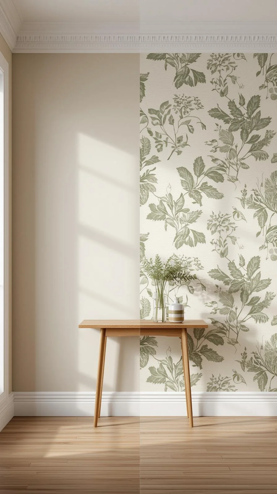 Avant j’avais des murs beige partout dans mon entrée – neutre mais sans âme. Maintenant: un seul mur avec papier peint motif botanique discret.