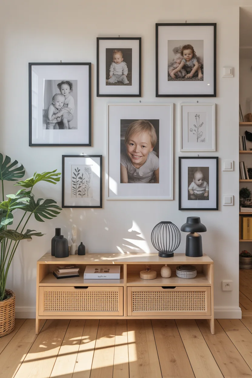 Ma galerie personnelle, c’est ma fierté ! Au lieu de laisser ce mur vide, j’y ai accroché nos photos de famille, quelques illustrations chinées, même des dessins de ma fille. Résultat : chaque invité s’arrête pour regarder, et moi je souris en passant.