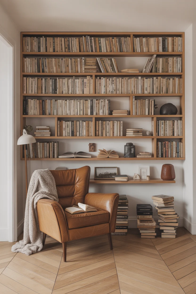 Mon astuce présentation : Je mélange livres debout et couchés, avec quelques objets déco entre. Ça casse la rigidité et c’est plus chaleureux. Et les plus beaux livres (art, voyage) bien en évidence pour tenter les curieux.