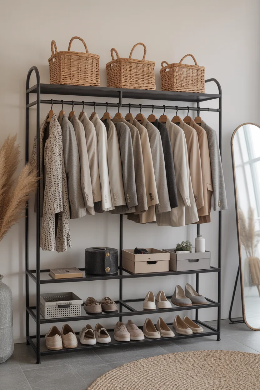 - Budget : 120-280€ (portant design + quelques boîtes de rangement)