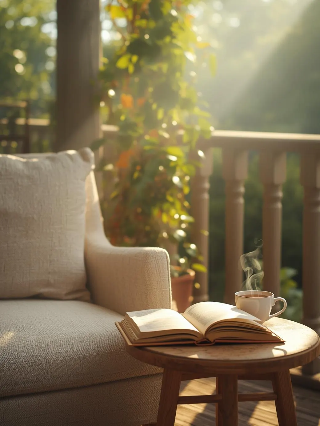 Un fauteuil confortable trouvé aux Emmaüs (60€), un petit guéridon en fer forgé (35€), une lampe de lecture à pince (25€), et quelques coussins résistants à l’humidité. Total: 150€ pour créer mon espace refuge préféré.