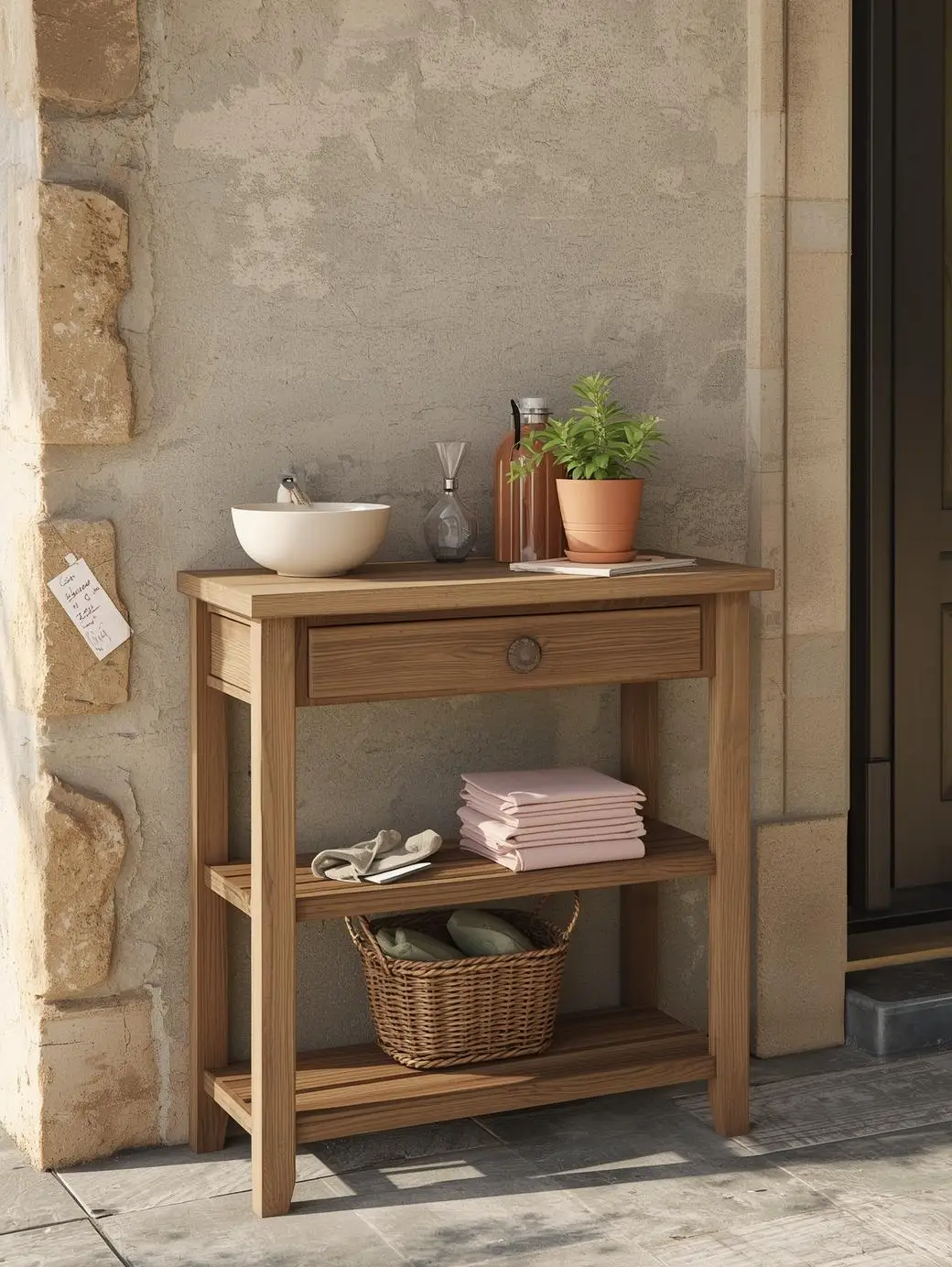 Tenez, celle-là est spéciale. Une simple console étroite (30-40cm profondeur) contre le mur du porche change complètement l’organisation quotidienne.
