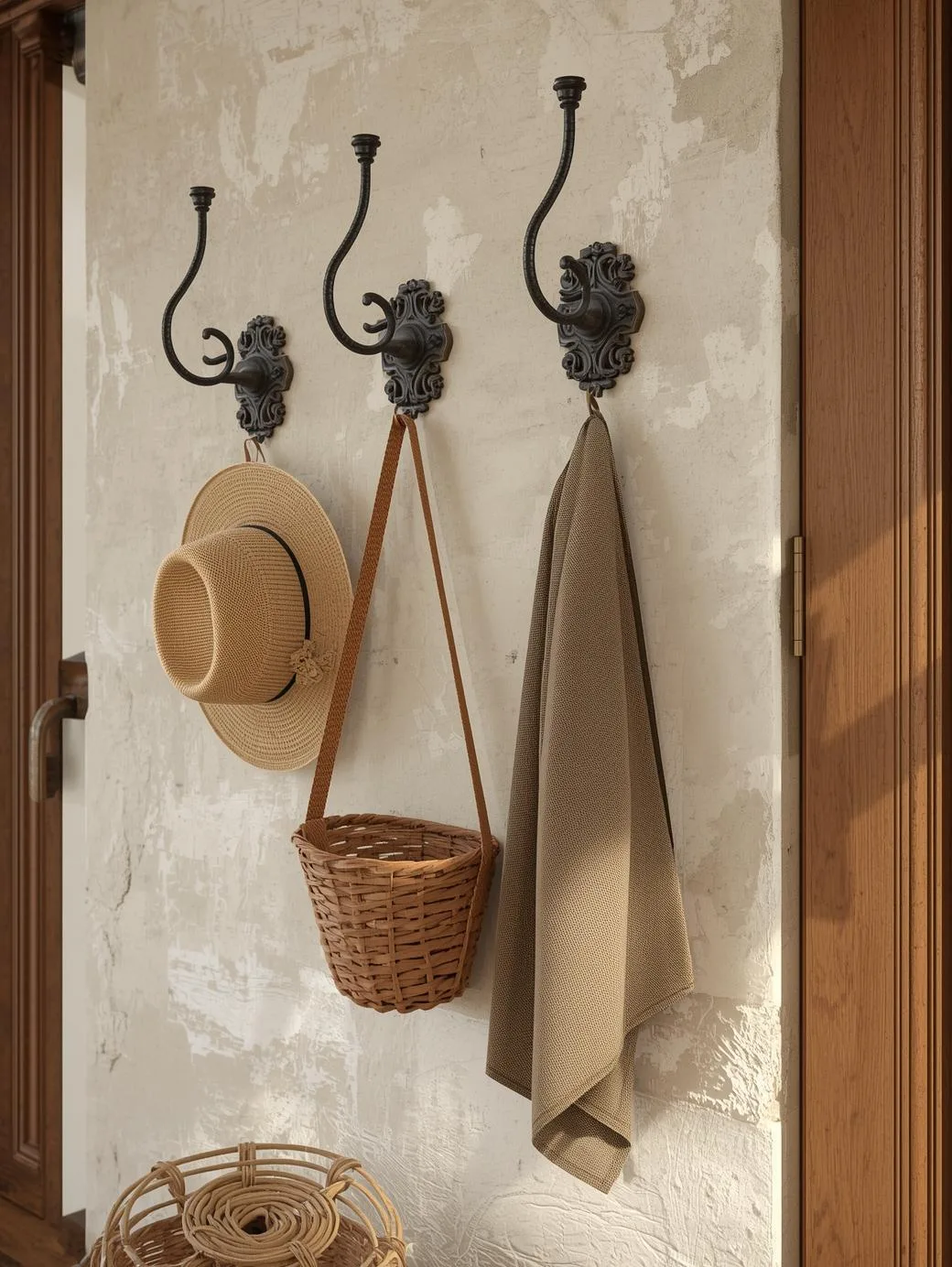 La réponse simple: Des crochets en fonte vintage fixés au mur du porche transforment le désordre (chapeaux, sacs, clés de jardin qui traînent) en rangement organisé qui fait partie de la déco.