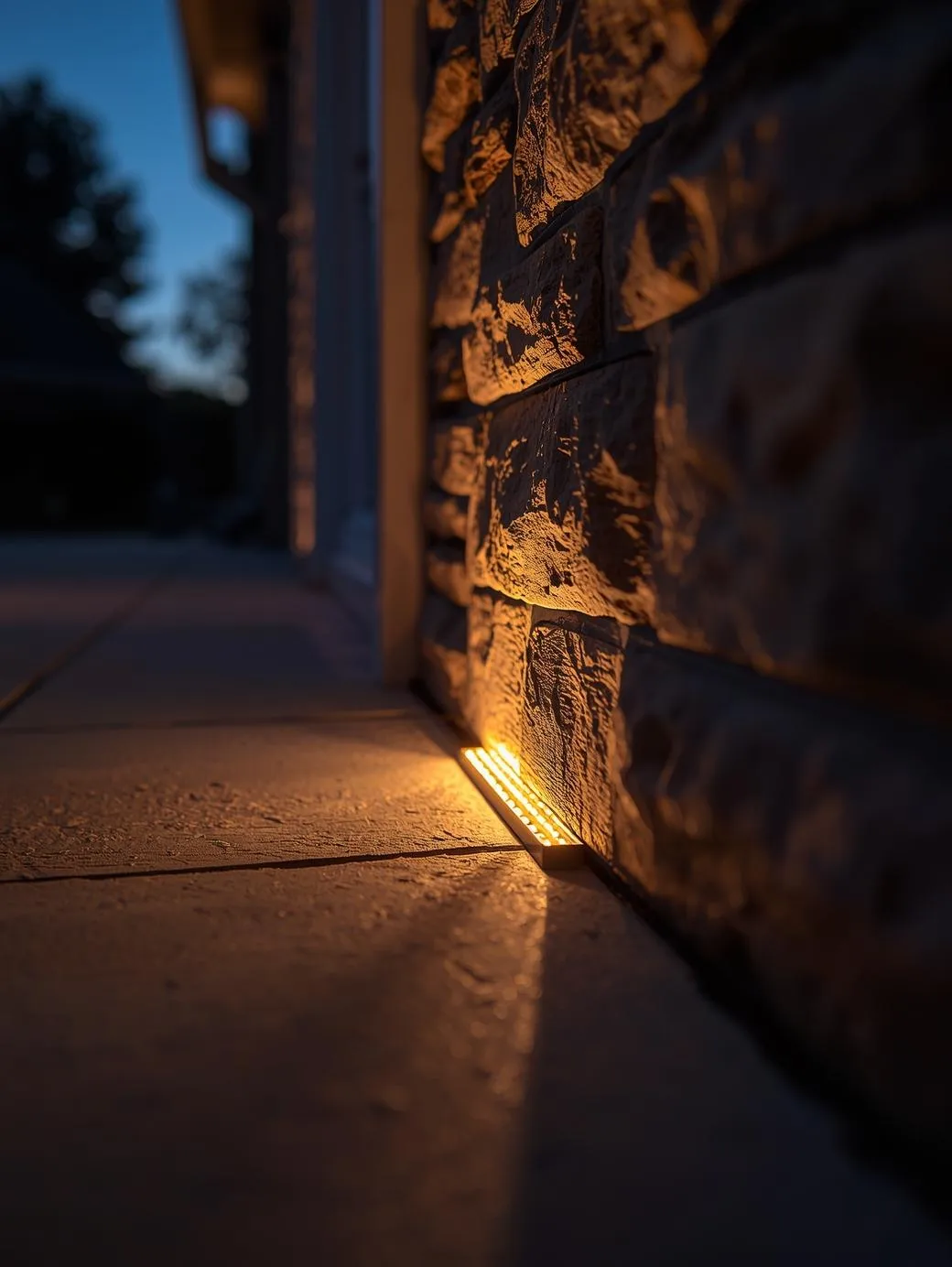 Peu de gens connaissent cette astuce d’architecte: des LED encastrées au ras du sol qui éclairent les murs du porche par en-dessous.