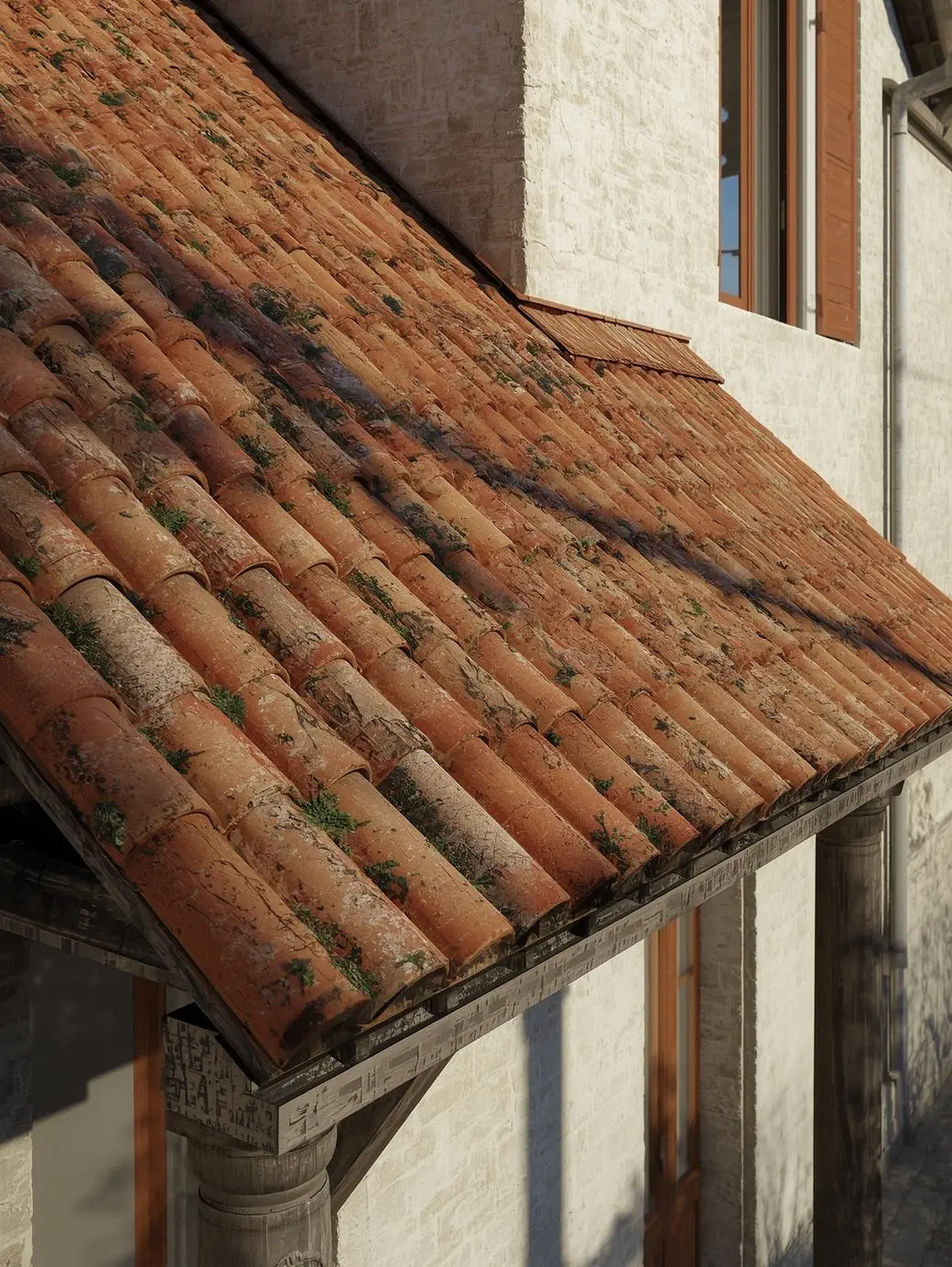 Avant j’avais des tuiles plates modernes sur mon porche. Maintenant: des tuiles canal rondes récupérées d’une démolition, avec leur mousse naturelle et leurs 80 ans de patine.