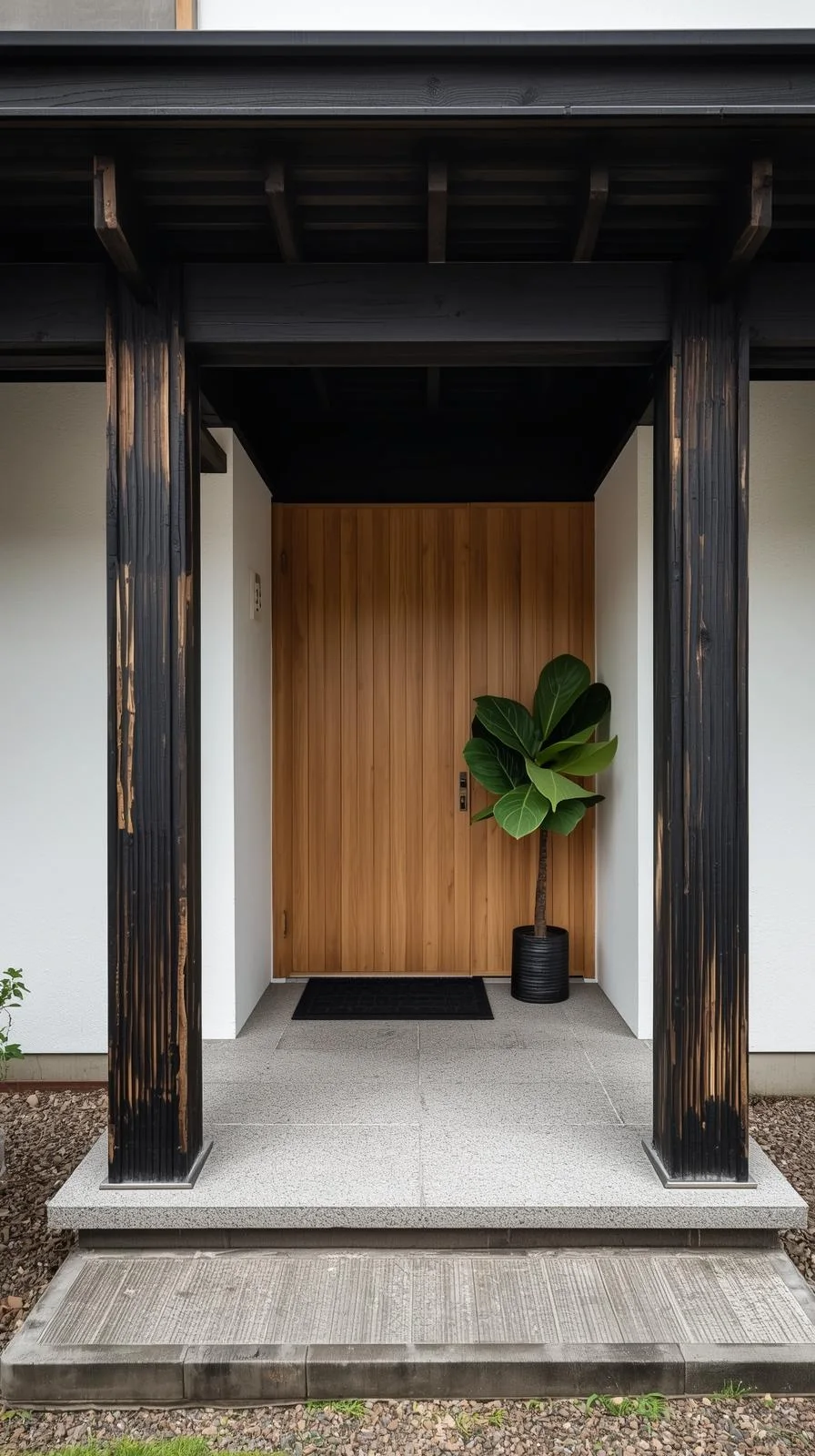 Avoue, toi aussi tu as entendu parler du bois brûlé japonais? Pour ce porche maison entrée moderne, c’est juste magnifique!