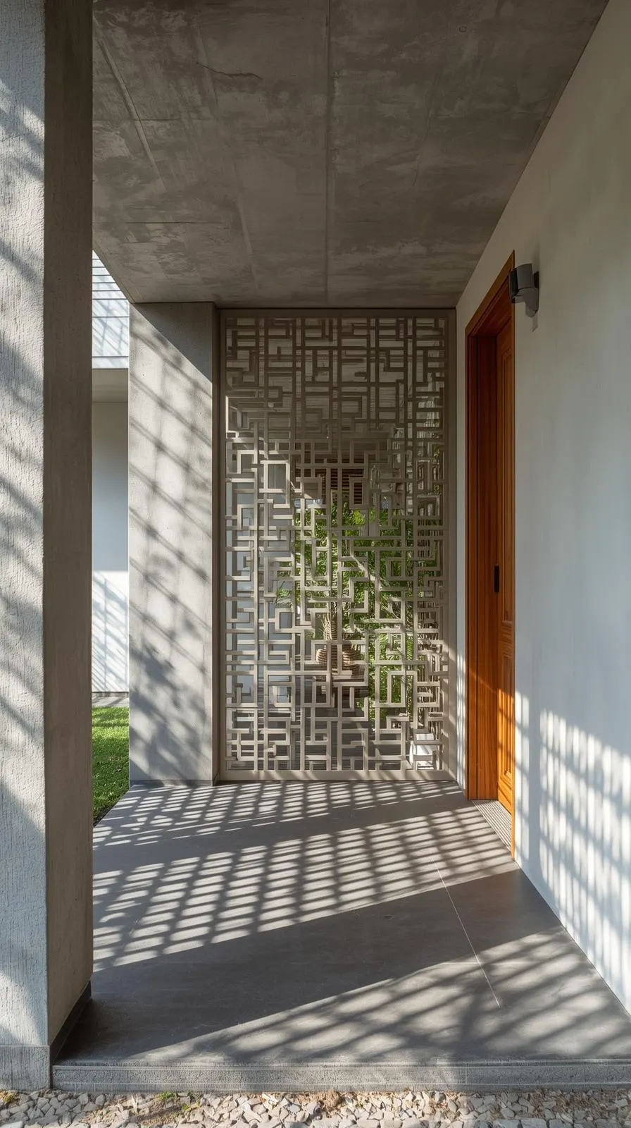 L’autre jour, je suis tombée sur un porche avec un claustra en béton et j’ai eu un vrai coup de cœur pour ce porche maison entrée moderne! Des motifs géométriques qui filtrent la lumière…