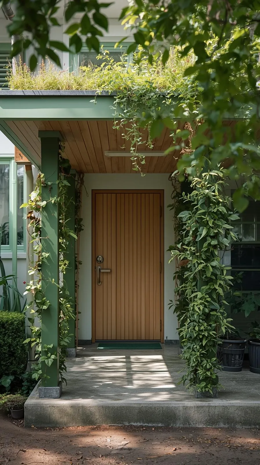 J’ai visité une maison éco-responsable près de Nantes où le porche était complètement végétalisé. Les plantes grimpaient sur les poteaux, le toit avait de la végétation… Tu rentres chez toi en traversant un jardin suspendu. C’est moderne ET vivant!
