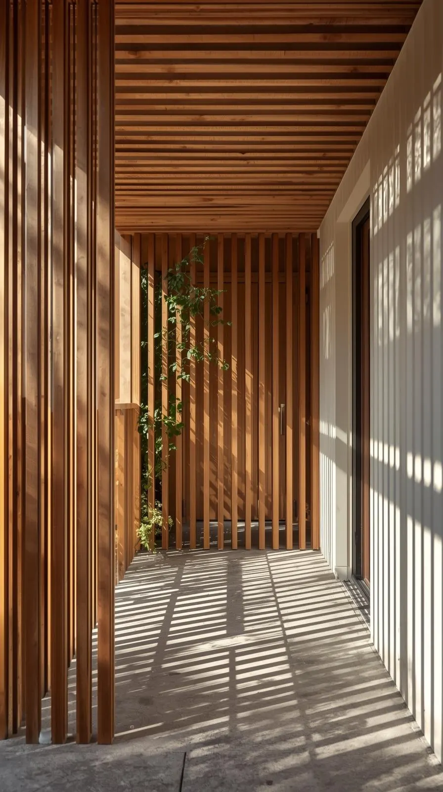 Attends, celle-là elle est vraiment top pour un porche maison entrée moderne qui joue avec la lumière! Des lames de bois verticales espacées qui créent un filtre…