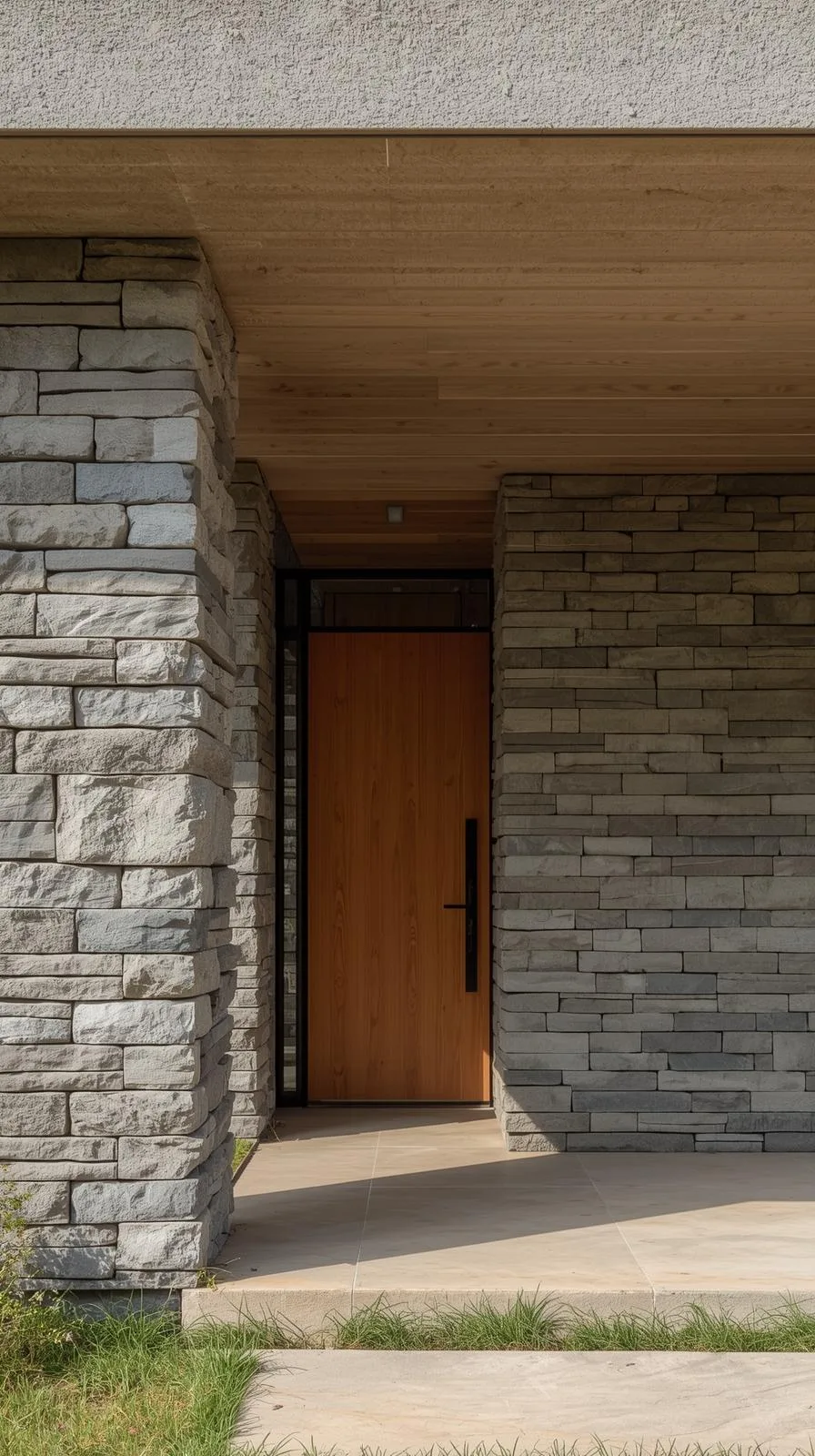 Tu vois ce que je veux dire quand je parle de cette masse minérale noble? Ce porche maison entrée moderne en pierre naturelle, c’est de la sculpture!