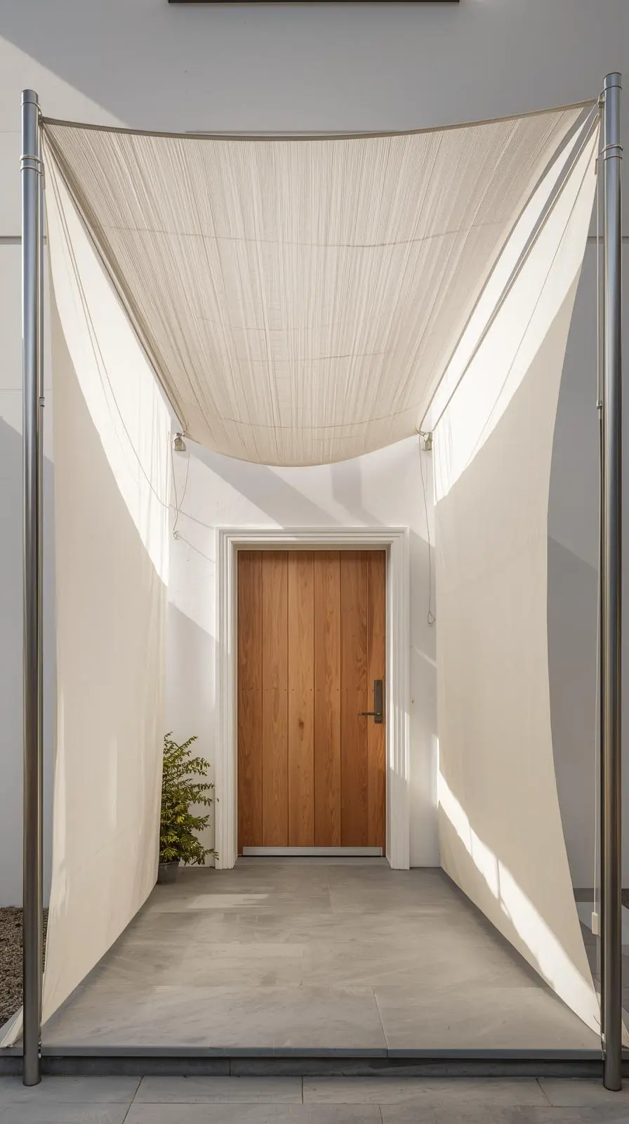 Attends, parce que là ça change vraiment tout pour un porche maison entrée moderne léger! Une toile tendue blanche qui semble flotter, c’est de la légèreté architecturale pure.