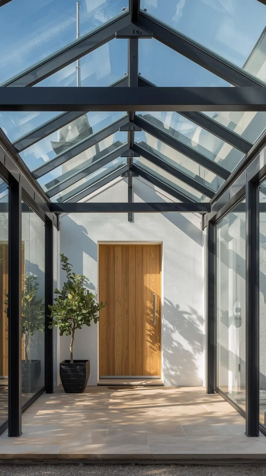 Écoute, cette idée elle est hyper efficace pour un porche maison entrée moderne qui disparaît! Un vitrage d’angle sans montant vertical, c’est de la magie technique.