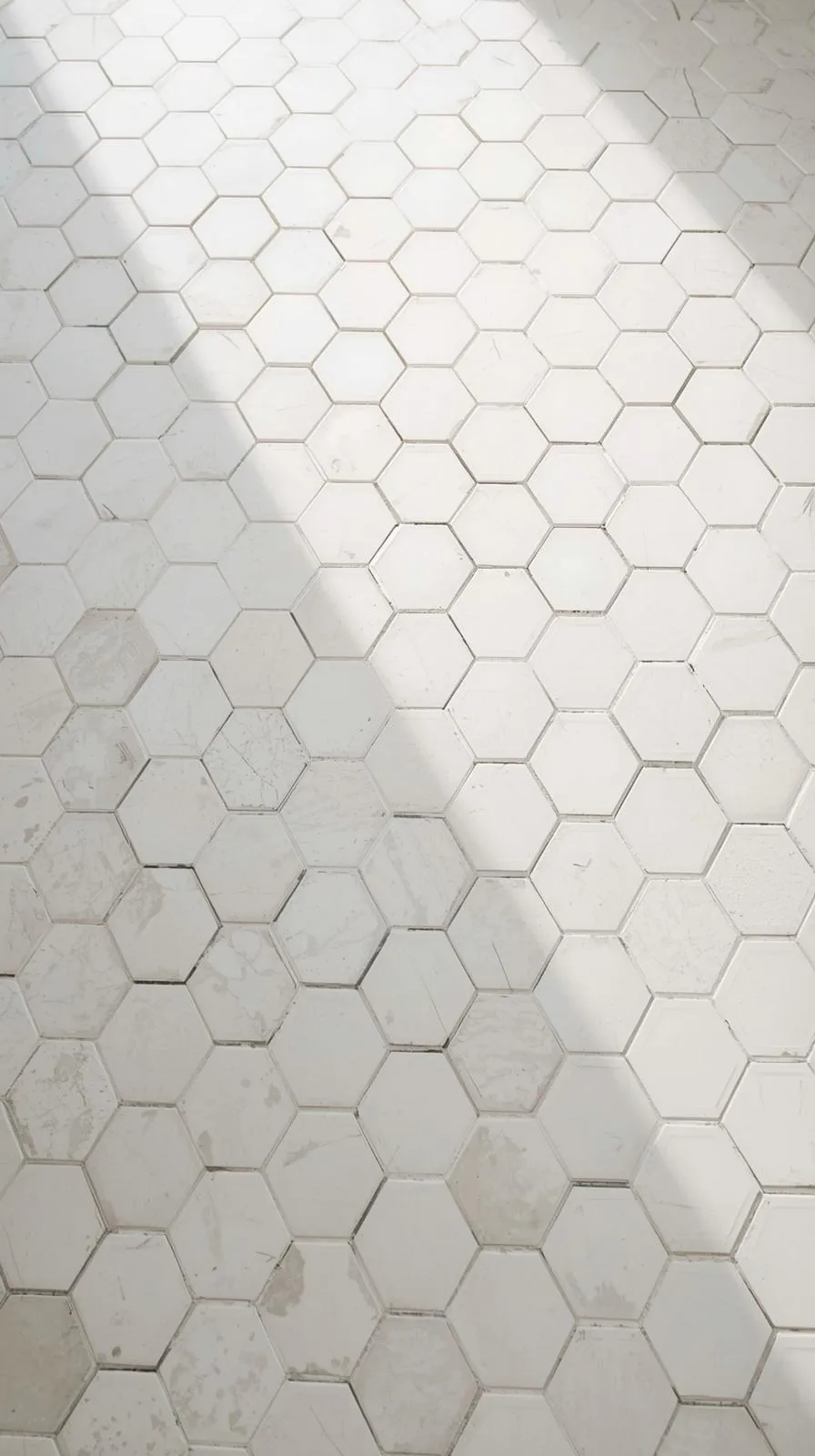 Bon, là c’est tout simple mais tellement efficace pour un sol entrée maison moderne et lumineux! Des hexagones blancs mats, c’est géométrique sans être froid.