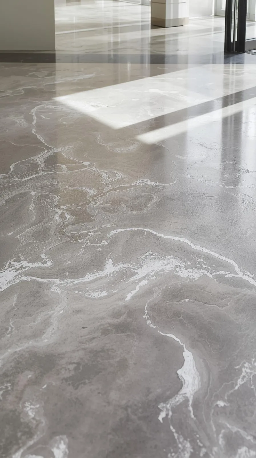Attends, celle-là elle est vraiment top si tu veux un sol entrée maison ultra moderne et personnalisé! La résine époxy avec effet nuagé, c’est de l’art au sol.