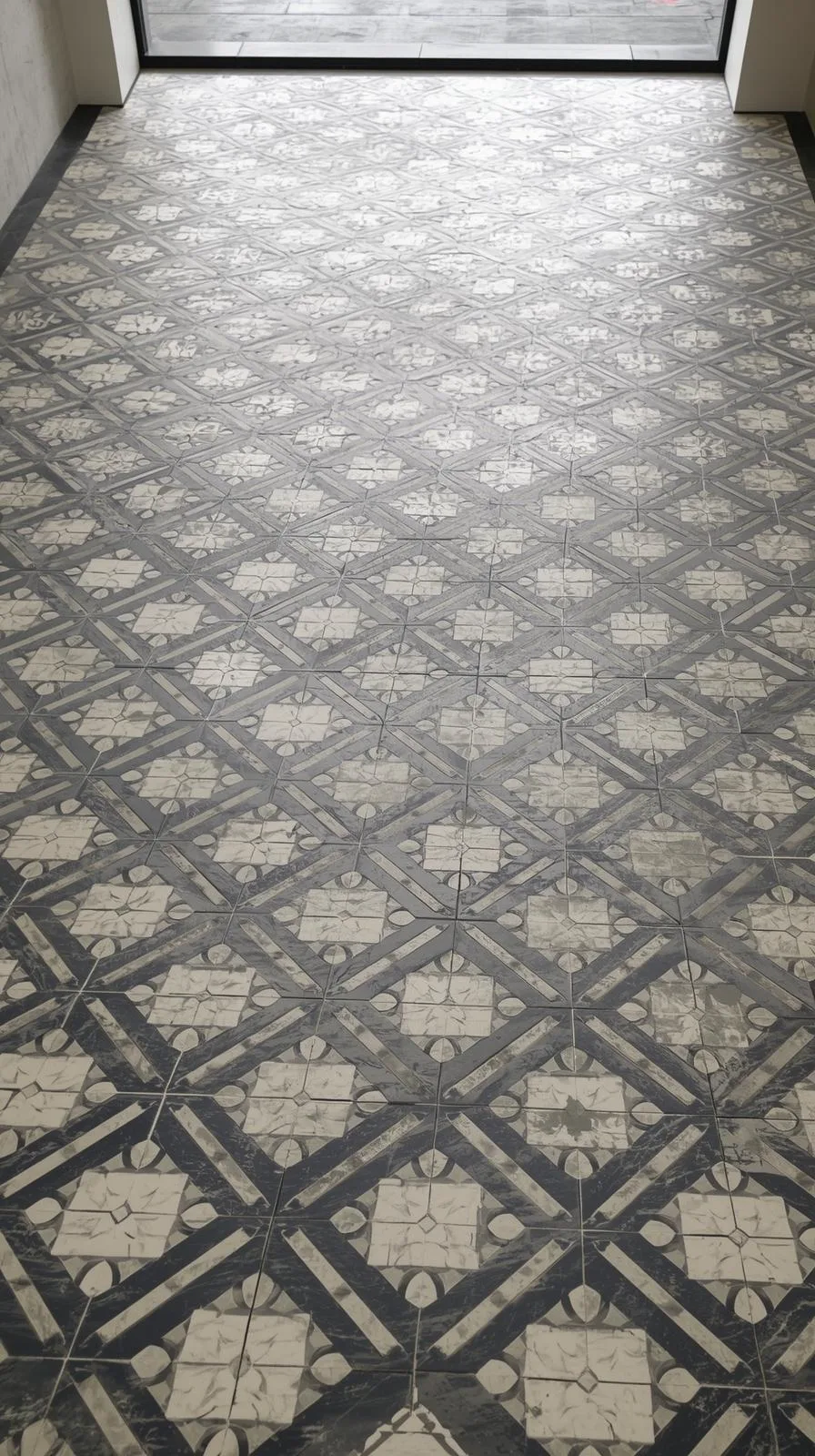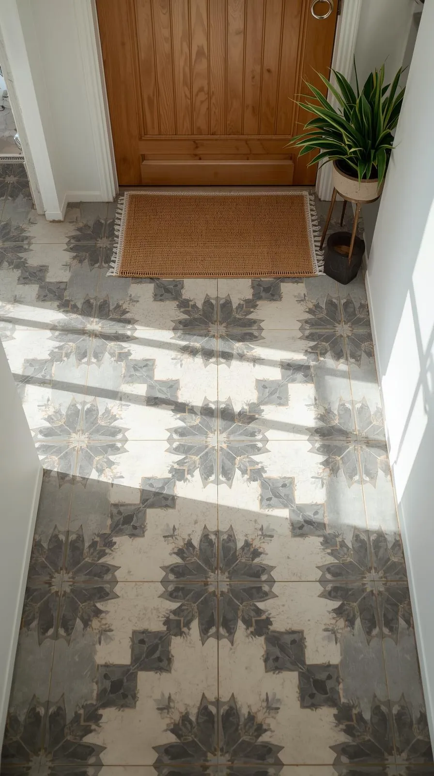 Attends, parce que là ça change vraiment tout pour un sol entrée maison petit budget! Le vinyle imitation carreaux de ciment, c’est l’astuce maligne.